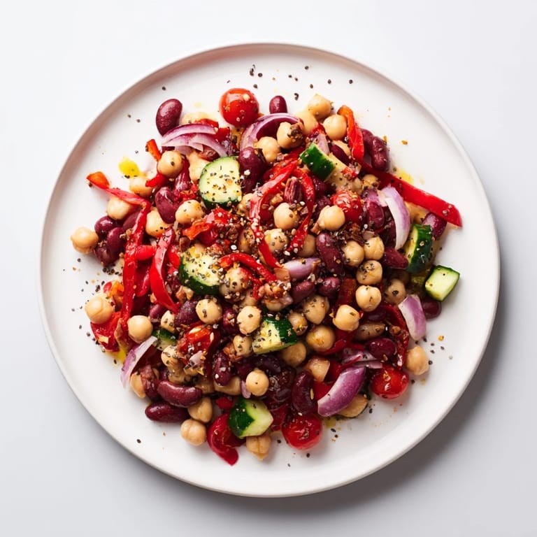 Chickpeas, kidney beans, and black beans form the protein-rich base, providing a hearty texture and flavor.