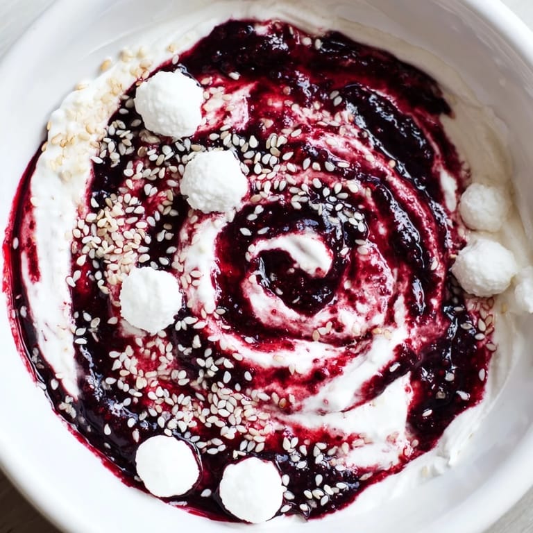 Save I discovered this dish quite by accident while standing in my kitchen on a lazy Sunday afternoon, staring at a container of Greek yogurt and a jar of dark berry jam that caught the light just right. Something about the way the jam's deep purple gleamed made me think of starfields, and before I knew it, I was drizzling and swirling, suddenly transported to a place where dessert became art. My partner walked in mid-creation and gasped like I'd painted something on the kitchen counter, and that moment of surprise sealed it—this had to become a regular thing. The beauty is that it takes ten minutes flat, yet feels like you've conjured something from another world.
