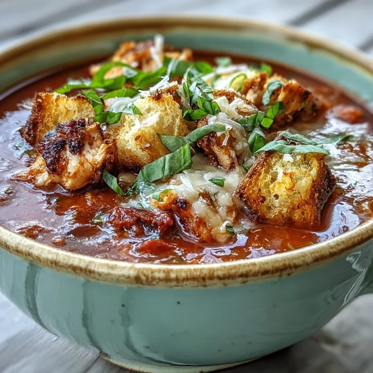 Save Bring the cozy, comforting flavors of an Italian-American classic to your kitchen with this Grilled Chicken Parmesan Soup. This hearty meal transforms the traditional breaded dish into a nourishing soup, combining smoky grilled chicken, a rich tomato-herb broth, and a luxurious blend of melted Parmesan and mozzarella cheese. It is a satisfying main dish that perfectly balances savory herbs and high-protein ingredients for a wholesome family dinner.