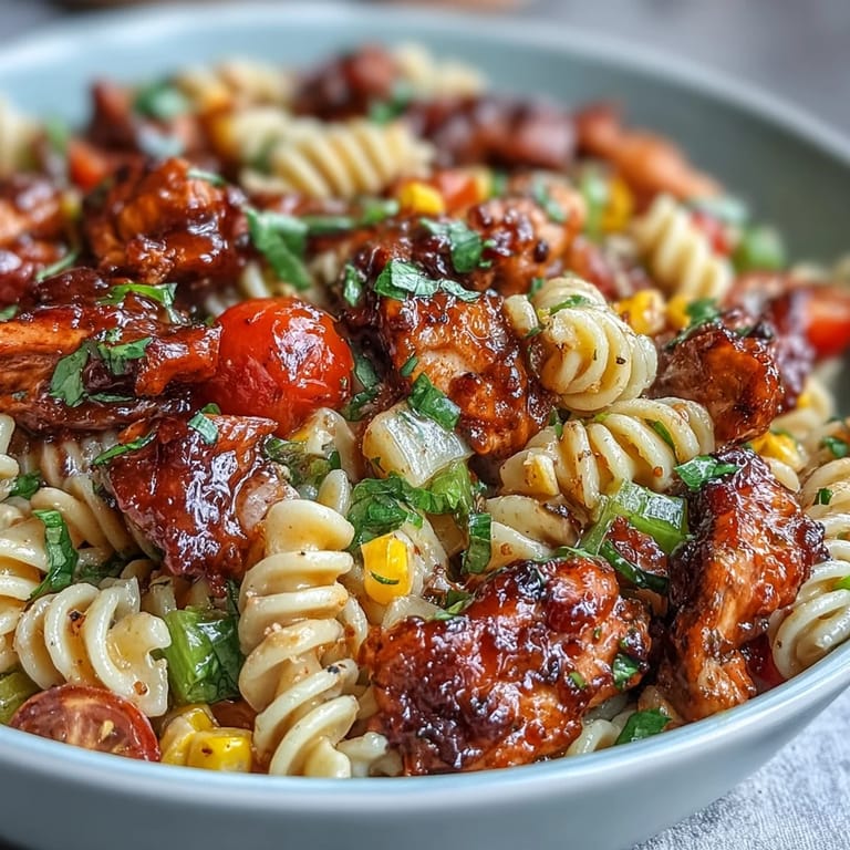Save My neighbor showed up with this pasta salad at a summer cookout, and I watched people go back for thirds—something that rarely happens with salads. The combination of smoky BBQ chicken with creamy dressing and crisp vegetables was so unexpectedly good that I asked for the recipe right there on the patio. What struck me most was how it tasted even better the next day, the flavors deepening overnight like they'd made friends with each other.