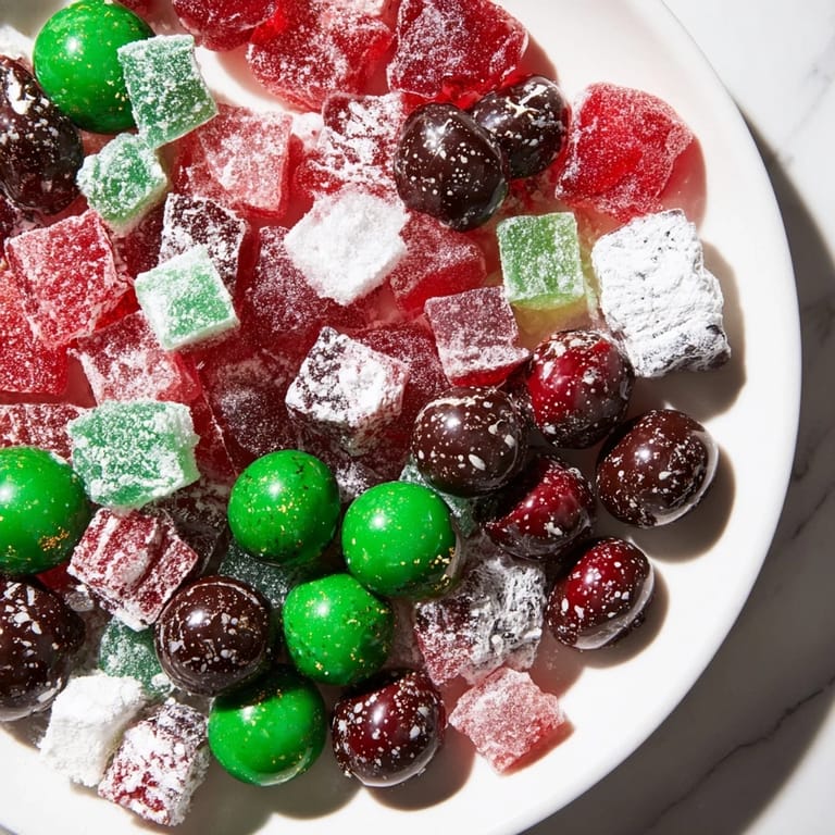 Save A festive dessert platter featuring a colorful assortment of homemade rock candies holiday-themed chocolates and sparkling sugar confections perfect for adding a sweet eye-catching centerpiece to your holiday table
