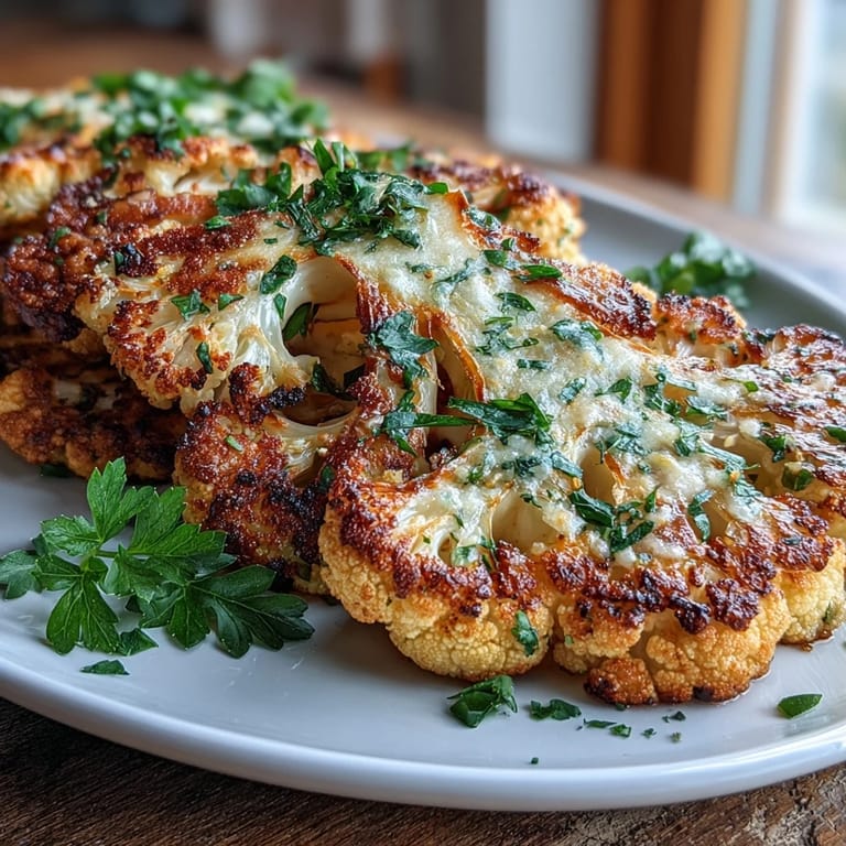 Save Transform your cauliflower into a gourmet experience with these Keto Garlic Parmesan Roasted Cauliflower Steaks. This dish elevates humble cauliflower into a star attraction that's worthy of being the centerpiece of your meal. The thick cauliflower slices develop a beautiful golden crust while roasting, creating the perfect canvas for the rich, savory garlic-Parmesan topping that adds incredible flavor to every bite. Whether you're following a keto lifestyle or simply looking to add more vegetables to your diet, these cauliflower steaks deliver a satisfying meal that's as visually impressive as it is delicious.