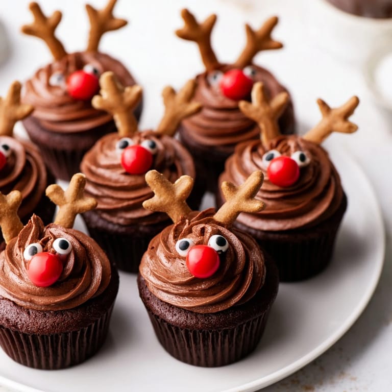 - Assemble cupcakes: Frost each cupcake with chocolate frosting. Insert gingerbread antlers (or pretzels), add candy eyes and red nose.